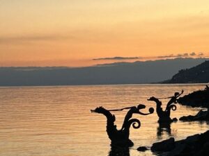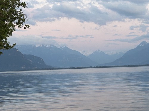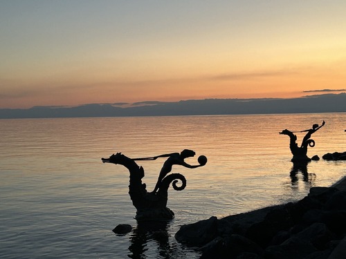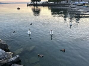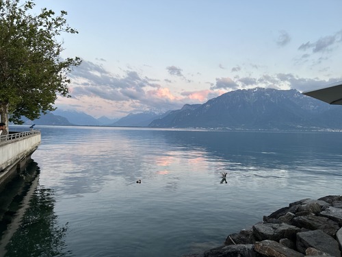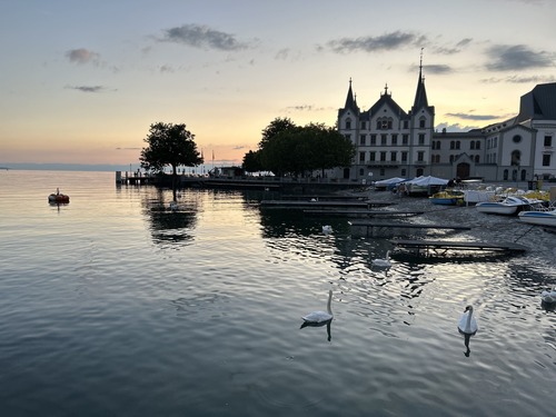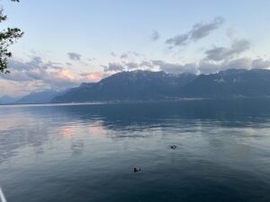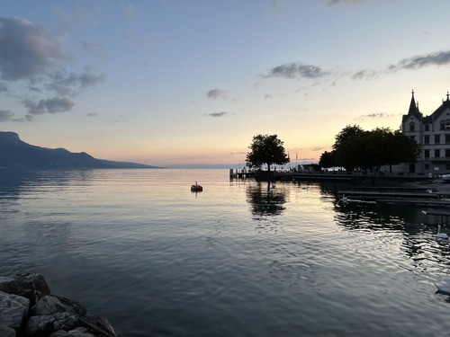 A notre retour sur Vevey, en descendant du funiculaire, nous n’avons pas pu résister à aller flâner sur les bords du Lac Léman : le coucher de soleil était trop magnifique !