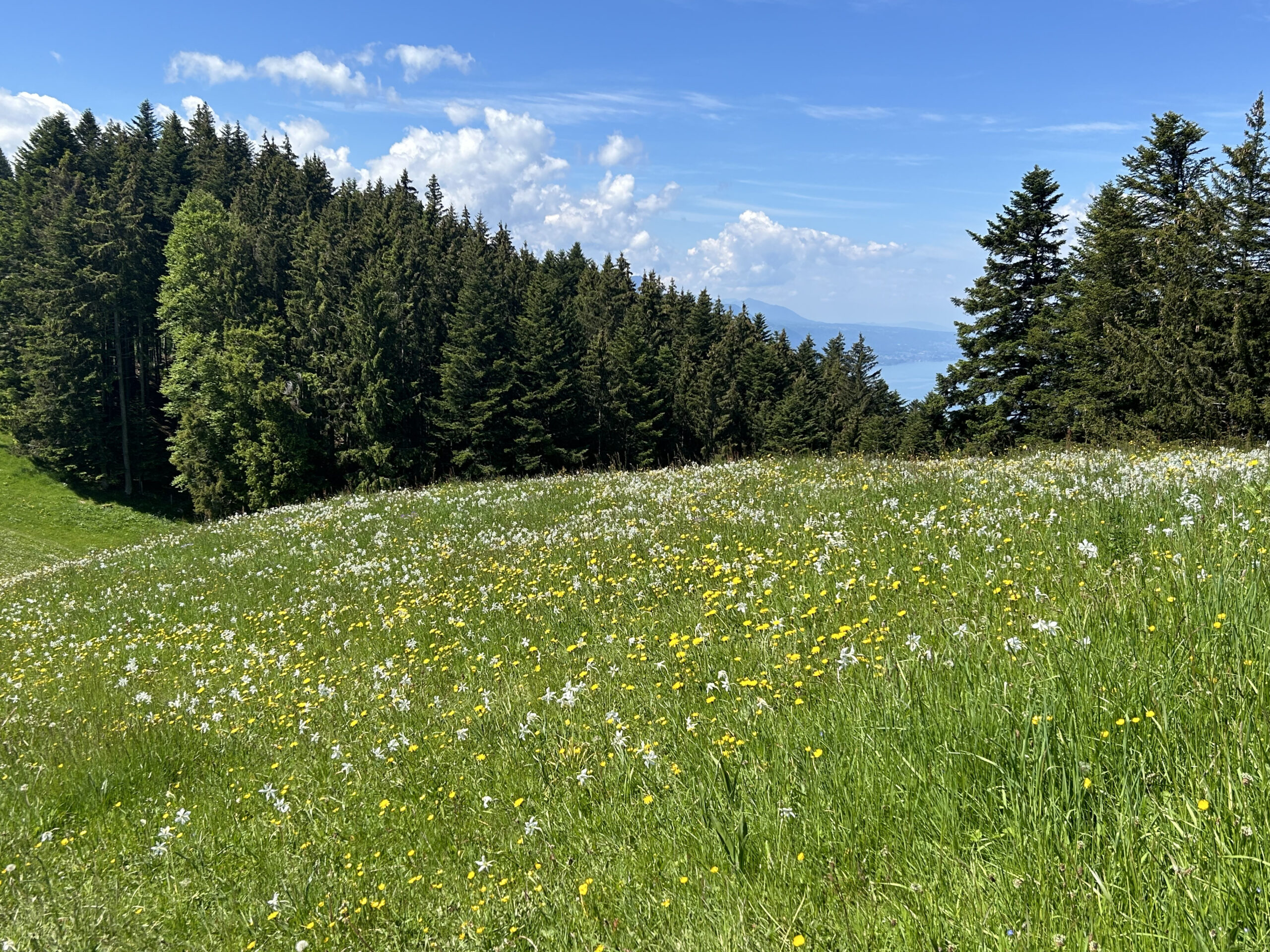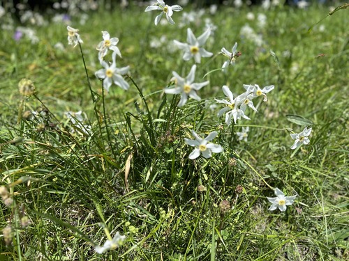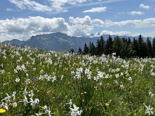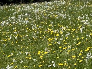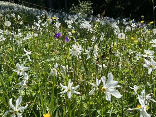 Nous avons particulièrement apprécié cette balade en montagne. Comme nous y sommes allés début juin, les prairies étaient couvertes de narcisses et de fleurs de champs. C’était vraiment magnifique !